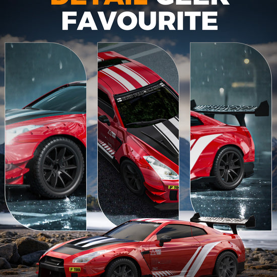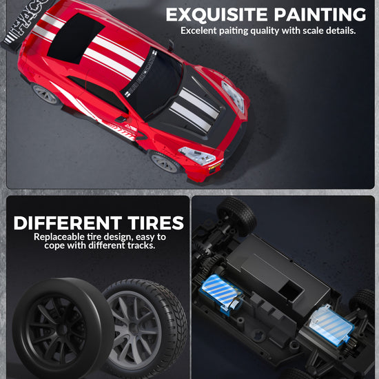 La voiture est dotée d'une coque robuste pour encaisser les bosses et de pneus épais et durables. Vous pouvez faire la course ou déraper, en glissant latéralement comme dans les films, grâce à des pneus remplaçables. Ses phares LED lumineux clignotent à la mise sous tension et un effet de brume rafraîchissante s'échappe à l'arrière lorsque vous appuyez sur un bouton de la télécommande, ce qui lui donne un look magnifique, surtout la nuit. - Temps de jeu et technologie